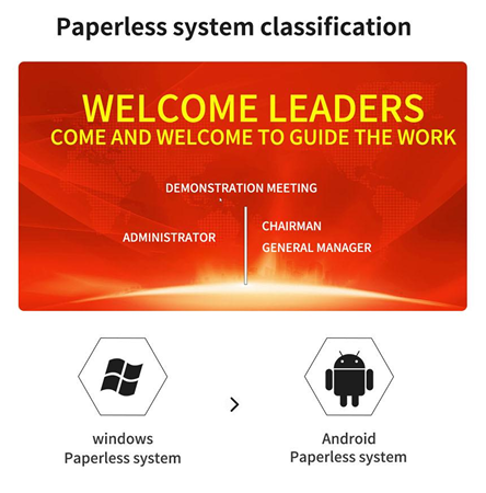 Системот за конференција без канцеларија на хартија е систем без хартија, прилагодена за владини агенции, претпријатија, институции и големи групни компании. Им обезбедува на учесниците исклучително удобна и практична платформа за конференции и е нов режим на конференција со крајна цел за намалување на трошоците на конференцијата, подобрување на ефикасноста на конференцијата, обезбедување на безбедност на конференцијата и подобрување на квалитетот на конференцијата.