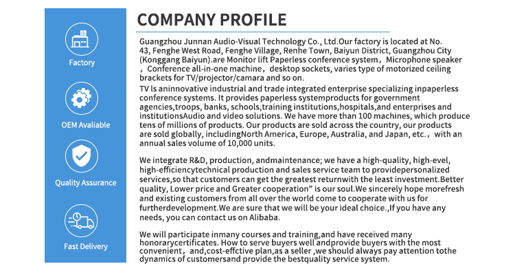Напредните електрични OLED монитори за подигање на LCD мониторот се погодни за сите видови сцени, имаме технологија за сечење со CNC машина и ласерска технологија, најнова технологија за кревање на LCD екран за конференциска маса за да се осигураме дека производот е со ултра високи стандарди. Сите наши OLED lcd подигачи на екранот припаѓаат на Произведено во Кина, достапни за купување на големо, може приватно да се приспособат за клиентите и имаат доволно електричен подигнувач на LCD екран на допир на залиха, поддржува брза испорака до клиентите. И нашата јунан опрема има различни сертификати за сертификати како што се CCC, CE сертификат, ROHS, ISO сертификат, производот е безбеден и квалитетен, со извозна квалификација, е директна фабрика со поволна цена, има своја фабрика и работи многу години.